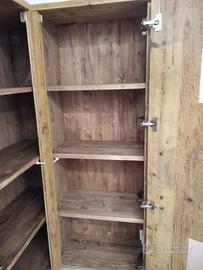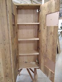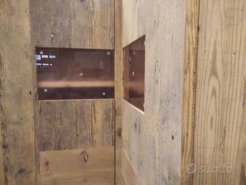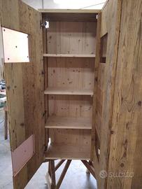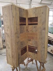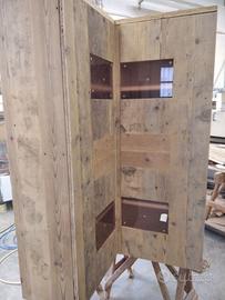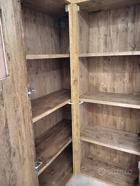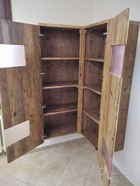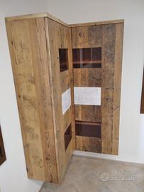 Angoliera Libreria sospesa nell'angolo costruita tutta in massello di abete vecchio recuperato da parancole e assi di muratori spazzolato con misura lungh. 90 x 55 nell'altro lato (costruita a L) profondità 35 h 150 costruito tutto a 3 strati esterno in legno vecchio interno tutto abete nuovo tintato schienale in abete nuovo che poi verrà tintato come fosse vecchio, internamente predisposto ripiani aggiustabile in altezza con ferramenta adatta, le 2 ante una per un lato sx e 1 per il lato di dx con relative cerniere a snodo 160° che agevoleranno apertura e verrà inserito vetro COME DA VOI SCELTO fumè. varie attaccaglie idonee per fissare il tutto al muro, Venatura orizzontale parte centrale delle ante, apertura push pull a pressione, Il tutto finito con finitura cerata trasparente mentre sbiancato parte inserto orizzontale. compreso di finitura imballo franco fabbrica non comprendente di iva. mobile è già stato prodotto su specifiche del cliente su commissione di conseguenza non è in pronta consegna e non teniamo a magazzino ma essendo i diretti produttori costruiamo solo su misura in base alle proprie esigenze, per dubbi e chiarimenti contattateci. direttamente dal produttore falegname costruiamo su misura a piacere del cliente. ASTENERSI RIVENDITORI E COMMERCIANTI