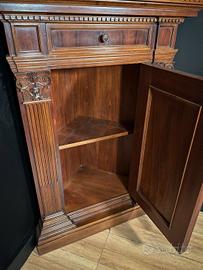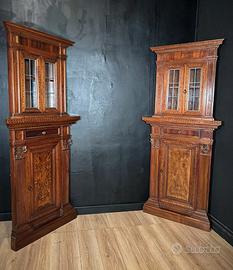 Elegante coppia di angoliere di gusto rinascimentale, realizzate in pregiato