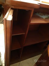 Mobile porta bottiglie, con 4 ripiani, due antine e 3 cassetti, 2 sgabelli, ideale per piccoli locali, cantine, tavernette o angoli bar.