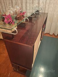 Se ami il fascino del modernariato italiano, questo angolo bar è un pezzo che non passa inosservato. Realizzato in legno scuro, con mensole in vetro e supporti metallici, richiama perfettamente lo stile domestico tipico tra gli anni ’60 e ’70, quando design e funzionalità si fondevano in un’estetica raffinata e accogliente.