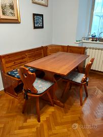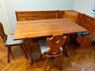 Tavolo fratino 130x80 , panca 56, panca 136, 2 sedie in pino tinto miele con cuscini