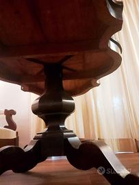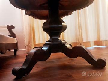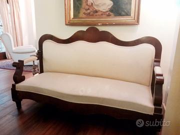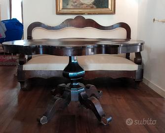 Angolo salotto Luigi Filippo originale: divano a "barchetta" in stile Luigi Filippo, 1850-1880 circa e braccioli a ricciolo con tavolo coevo stile fratino con piano sagomato a mossa e basamento a tripode.