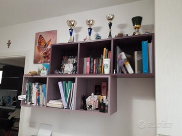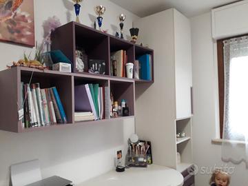 Scrivania con cassettiere, armadietto alto e mensoline sopra ideali per libri