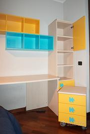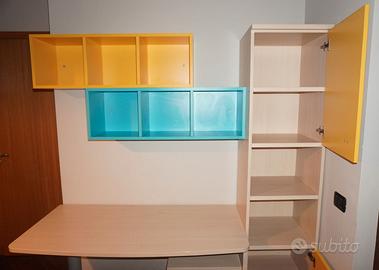 Vendo bellissimo angolo studio completo per cameretta di produzione artigianale italiana, caratterizzato da un design moderno e colorato (giallo e azzurro) con simpatiche maniglie a forma di puzzle. Il mobile è molto funzionale, ideale per bambini o ragazzi, ed è in ottime condizioni generali.