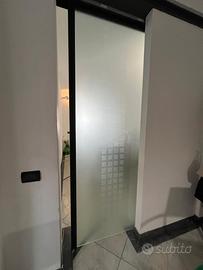 Porta/anta scorrevole esterno muro della HENRY GLASS, in vetro temperato A10 con montanti laterali grigio antracite, decoro centrale Quadar , ancoraggio a soffitto con binario. Larghezza anta 91 cm. Altezza anta 234cm.
