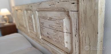 L'anta del portoncino di legno massello è perfetta usata come testiera in una camera in stile arte povera o shabby.