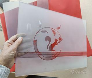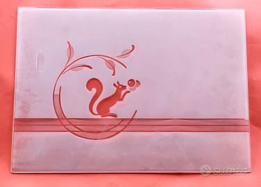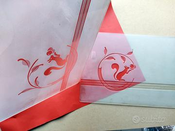 Due ante in vetro trasparente satinato con decori stilizzati, già in uso scorrevoli su vecchia credenza anni '50. Interessanti per restauri o sostituzioni in credenze vintage. Dimensioni 50 x 35,5 cm