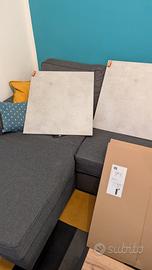 3 ante grigie con finiture marmo con maniglia in pelle montata sull'angolo.