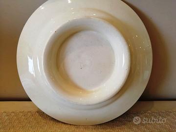 Sul retro il marchio incusso purtroppo non si distingue bene, a esclusione della scritta Ter che lascia intuire la parola terre de fer, che riporta a una manifattura francese, e sopra una S (Sarreguemines?). Circa la datazione, in considerazione dello stile e della decorazione, dovrebbe collocarsi tra fine 800 e inizio 900. In francese viene definita "compotier" , un oggetto originale che mantiene tutto il suo fascino d'antan.