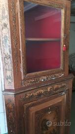 Vendo splendida angoliera d’epoca risalente alla fine del ‘700, in legno dipinto e decorato con motivi floreali e scene paesaggistiche. Mobile molto particolare e decorativo, con: * parte superiore a vetrina * interno rivestito (rosso) con ripiano * parte inferiore con anta decorata * ricche finiture intagliate e dipinte a mano Condizioni: il mobile è da restaurare, presenta segni del tempo, usura della vernice e piccoli difetti (come visibile in foto), ma struttura solida e grande potenziale dopo restauro. Perfetto per amanti dell’antiquariato o per progetti di recupero. Ritiro a mano – visione senza impegno