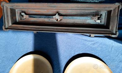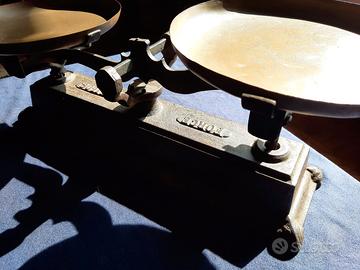 Bilancia francese a due piatti di tipo Roberval, presumibilmente di fine '800, portata massima 10 kg. (come da stampigliatura alla sommità: FORCE 10 KILOG.). Corpo in ghisa/ferro e piatti in ottone. Condizioni come da foto: meccanica funzionante; presenza di patina originale sulla base e opacità sui piatti, che ne testimoniano l'antichità. Dimensioni in cm.: altezza 19; lungh. massima (con i piatti) 57; lunghezza della base 46; profondità massima (con i piatti) 22,6; profondità della base 12; diametro piatti: 22. Peso: circa 5 kg. Per più ampia documentazione fotografica e per eventuale SPEDIZIONE scrivetemi. Visibile a TORINO Porta Susa e occasionalmente anche ad ASTI o lungo tutto il percorso Torino-Asti della S.S. 10.