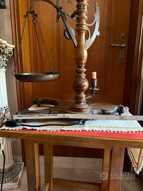 Originale e affascinante bilancia antica tipo stadera, risalente ai primi del ‘900, successivamente trasformata in elemento decorativo con funzione di lampada.