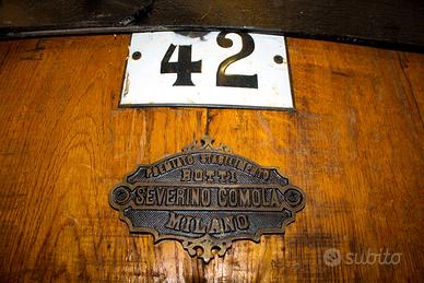 🍇 Mastodontico Tino Storico (30.000 Litri) – Severino Comola Milano Raro e Pregiato Tino di Storica Manifattura Milanese – Ideale per Collezionisti e Grandi Cantine In vendita un eccezionale e monumentale tino in legno massello, con una capacità stimata di circa 30.000 litri. Ciò che rende questo pezzo unico è la sua targa originale in ghisa che ne attesta la provenienza: "PREMIO STABILIMENTO BOTTI SEVERINO COMOLA MILANO". Severino Comola è un nome storico e prestigioso nella tradizione italiana della tinozzeria, specialmente nel Nord Italia, conferendo a questo tino un valore che va oltre la semplice capacità di stoccaggio, rendendolo un vero e proprio pezzo da collezione industriale. Provenienza Certificata: Tino prodotto dallo Storico Stabilimento Severino Comola di Milano, sinonimo di altissima qualità nella produzione di botti e tini nel XIX e XX secolo. Capacità Gigantesca: Circa 30.000 Litri Materiali Nobili: Realizzato con doghe di legno massello stagionato (presumibilmente Castagno), unito da robuste cerchiature metalliche. Stato di Conservazione: Il legno presenta la patina del tempo e dell'utilizzo intensivo in cantina, con il numero di inventario "42" ben visibile. La struttura è solida e adatta al restauro per il riutilizzo funzionale. Valore Aggiunto: La targa di provenienza non è solo un dettaglio estetico, ma un elemento che ne accresce il valore storico e collezionistico. 🌟 Potenziale di Riconversione Unico Grazie alla sua storia e alla provenienza milanese, questo tino è perfetto per: Cantine Storiche/Aziende Vinicole: Rimetterlo in funzione (dopo opportuna sanificazione) per la fermentazione o l'affinamento di vini di pregio, sfruttando la qualità del legno e la sua storia. Architettura d'Interni/Ristorazione: Trasformarlo in un esclusivo elemento scenografico per enoteche, ristoranti di lusso, o spazi espositivi, dove la targa Comola può essere un valore aggiunto Da smontare p.sso nostro magazzino, tutte le assi sono già state numerate