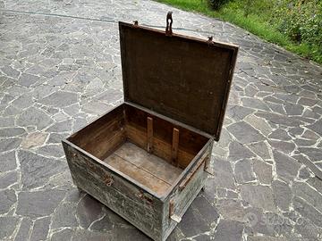 Antica cassa baule forziere da viaggio in legno e lamiera.
