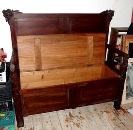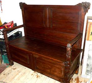 cassapanca con spalliera , mobile portabiancheria antiquariato / modernariato ,in legno lavorato con decorazione floreale , misure : la cassapanca e' larga cm 125 , alta in tutto cm 112 , la seduta e' alta cm 48 e la spalliera cm 64 , la profondita' e' di cm 50 , condizioni discrete con segni di uso e del tempo diffusi comunque molto bella e pregiata , solo ritiro a santa marinella ( rm )