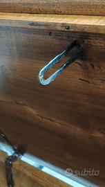 Cassapanca del 1800 Lombardo fatta a mano da artigiani di montagna Varzi PV, restaurata sverniciata a legno è tornata come nuova, in legno di noce, tavole uniche, serratura sua originale con chiave rifatta funzionante, chiodi in ferro battuto a mano potrebbe essere anche fine settecento perché dopo quel secolo si usavano chiodi tondi di fabbrica quasi industriale. Misure altezza cm 59, larghezza cm 50, lunghezza cm 154.
