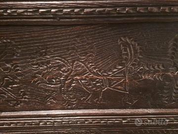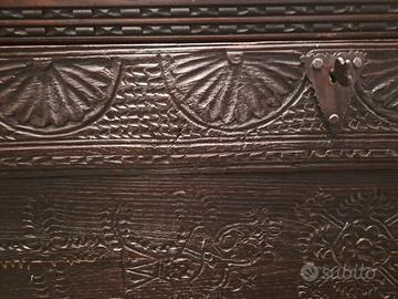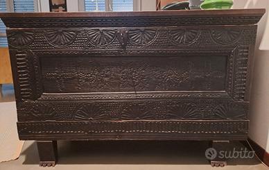 Antica cassapanca sarda finemente intagliata sul fronte con motivi geometrici e volatili retta da piedi intagliati.