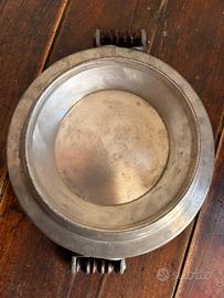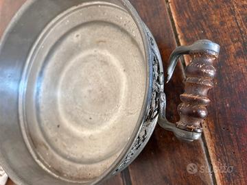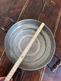 Antica ciotola in peltro lavorata a mano con un manico crepato. Maniglie in legno. Condizioni buone per l’età. Dimensioni come da fotografie.
