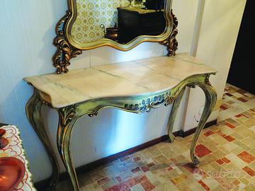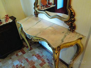 Antica consolle primi del ‘900 in legno color oro con specchiera e top in marmo