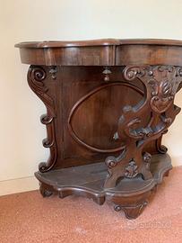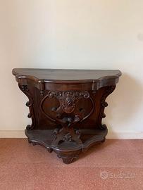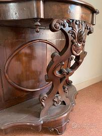 Elegante consolle antica in legno, epoca Luigi Filippo, non restaurata. Presenta una struttura solida con bellissimi intagli che ne esaltano la raffinatezza. Perfetta come elemento di arredo per l'ingresso, sala da pranzo, soggiorno o camera da letto. Misura: 110 cm larghezza totale 90 cm altezza 48 cm profondità massima
