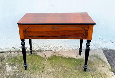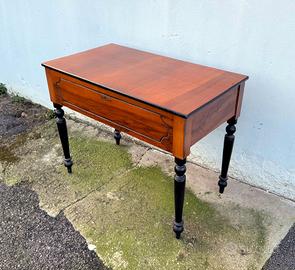 Tavolo parietale, sec. XIX, in noce, piano rettangolare sotteso da cassetto a tutta lunghezza dal fronte scanalato motivo mistilineo, gambe tornite ed ebanizzate, finitura che si presenta sul bordo del piano, cm 108x59 x h 83,5