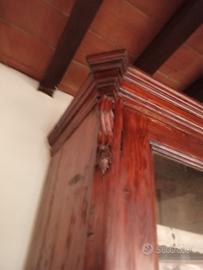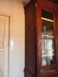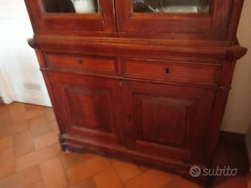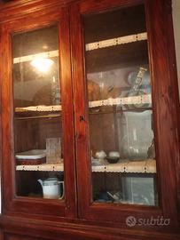 Credenza fine '800in legno povero, costituita da due parti, i vetri sono ancora originali d'epoca congiunti tra loro da una bacchetta in rame, misure 129x50,h.240cm