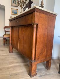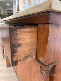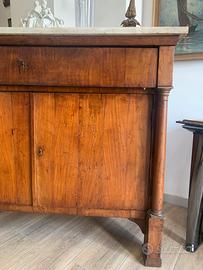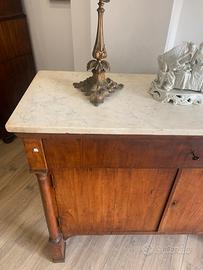 Antica credenza impero lastronata in noce con piano in marmo bianco statuario spesso 2 cm . Misura H 99 L 122 P46