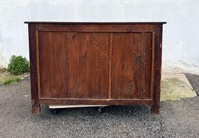 Credenza, sec. XIX, in ciliegio, piano rettangolare ad angoli frontali stondati, sotteso da cassetto a tutta lunghezza, fronte a due sportelli tra coppia di lesene a bretella con capitelli e piede ebanizzati, sostegni a plinto, cm 100x45xh100