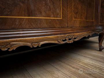 di noce, con eleganti intarsi in acero, questa raffinata credenza esibisce una