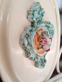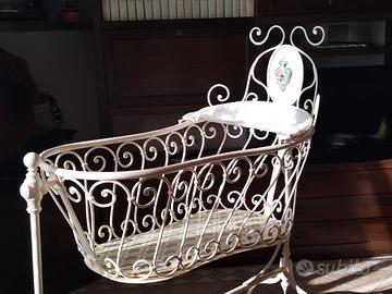 La culla bascula silenziosamente e molto bene, con possibilità del bloccaggio. La capotte è richiudibile. Inserto tridimensionale d'epoca con soggetto floreale sull'ovale che la sormonta. Il fondo è in ferro battuto con l'aggiunta di una base in legno sagomata e foderata.