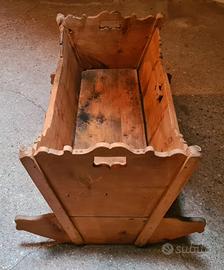Antica culla di origine trentina periodo di appartenenza 1880-1930 le misure sono lunghezza 95 altezza 49 larghezza piedini parte curvato per il dondolo 66. Adatta per arredamento rustico, shabby, country. Allestimento vetrine, agriturismo, B&B, uso decorativo o porta coperte, piante, riviste, adatta per collezionisti di oggetti d'infanzia antichi.