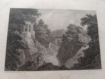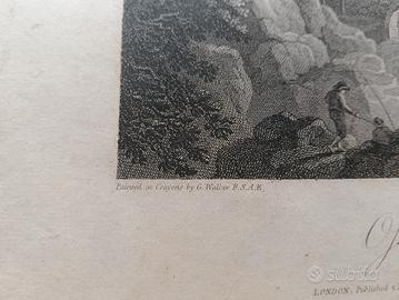 Antica incisione originale di William Byrne da George Walker, 'Ossian's Hall, Dunkeld', incisione, anno 1803 misure 32x26. Compresa cornice. Guarda gli altri miei annunci