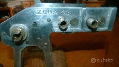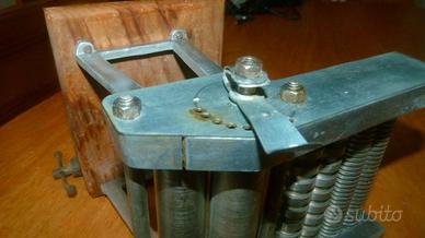 Macchina per pasta ZENA 42. Meccanismo di rotazione e regolazione spessore della sfoglia funzionanti. Segni di usura e ossidazione. Completa di manovella e gancio di fissaggio. Base in legno originale, non in alluminio degli altri modelli.