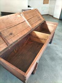 Madia di inizio '900 di legno massiccio, misure 210 cm x profondità 69 cm x altezza 70 cm; recuperata da stalla di montagna. Di pregio sono le sponde laterali, tenute insieme da pregiati incastri del legno originali, senza chiodi (dettagli come da foto). Eseguito leggero restauro con pulitura e nutrimento del legno con olio apposito, adattato il coperchio rendendolo apribile con cerniere originali di fine '800 e maniglia d'epoca. Presenti piccoli difetti in prossimità di 2 piedini, ma struttura solida e stabile. Ideale per arredamento rustico. RITIRO A CARICO DEL CLIENTE