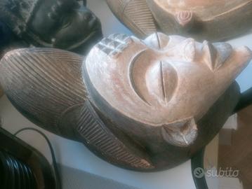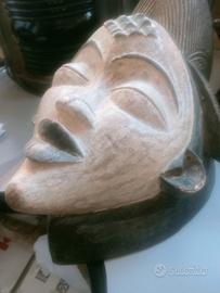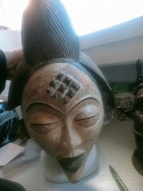 figura femminile misura cm 40x20x23 scolpita nel legno a mano come di vede in foto cultura Punu rappresenta ed onora lo spirito dei defunti il volto è dipinto con caolino bianco accentuato dal nero delle labbra e un' elaborata capigliatura. gli occhi a chicco di caffè sono socchiusi e sulla fronte una rituale scarificazione. patina e scolorimento del tempo collezione privata