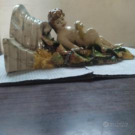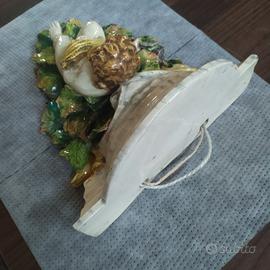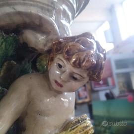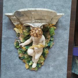 Antica Mensola marmorizzata in Ceramica con Putto & foglie