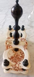 Oliera francese inizio XX sec. In ceramica Terre de Fer colore panna con disegno rosso-marrone e colonnine in legno tornite e laccate colore ebano.