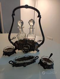 Antica oliera italiana argento 800 con grande manico detto a cestino, piedini a ricciolo e corpo sbalzato, con volute e motivi floreali in stle liberty completa delle 2 ampolle in vetro.