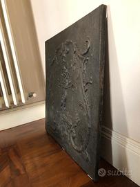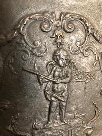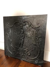 Vendo stupendo fondale / piastra da camino in ghisa di provenienza francese con raffigurato un putto neoclassico nell'atto di accendere un fuoco. In magnifiche condizioni d'epoca, pronta per l'installazione per impreziosire un camino importante. Misure 55x55 cm. Peso circa 39 kg. Disponibili altre foto/info su richiesta. Solo ritiro a Roma Prati a carico dell'acquirente, non disponibile la spedizione. Astenersi non realmente interessati grazie.