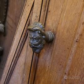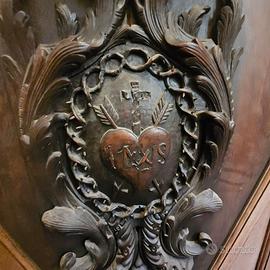 Antica Porta Ecclesiastica Italiana, dimensione 90x220cm, spessore 10-12cm in massello di noce molto compatto, con intarsi su un lato, con lo stemma del Sacro Cuore di Gesù, in ottimo stato, rigenerata, con datazione presunta tra il XVI ed il XVII secolo, di provenienza italiana o spagnola