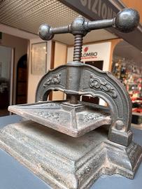Vendo bellissima pressa per libri in ghisa, originale di fine ’800 / inizi ’900, utilizzata nelle antiche legatorie e tipografie. Si tratta di un oggetto autentico, solido e pesante, dotato di vite centrale con volantino che permette di esercitare una forte pressione uniforme.