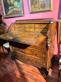 fronte leggermente mosso e impreziosito da cornici, anta centrale a ribalta con cassetti interni e segreti sul piano e all‘interno dei cassetti centrali.
