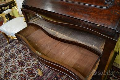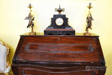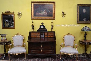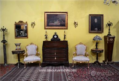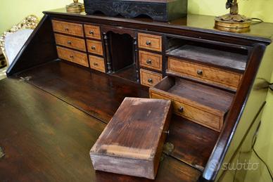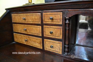 Il mobile presenta un piano di scrittura a ribalta , dove all’interno si celano 12 cassetti di varie dimensioni ( 6 per lato ) lastronati in radica di betulla con filettaure in ebano, vano centrale con specchio rifinito da due colonnine tornite.