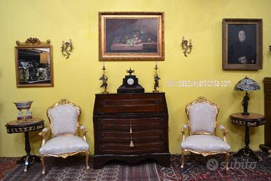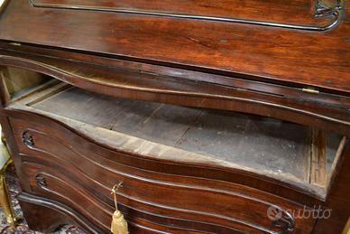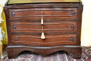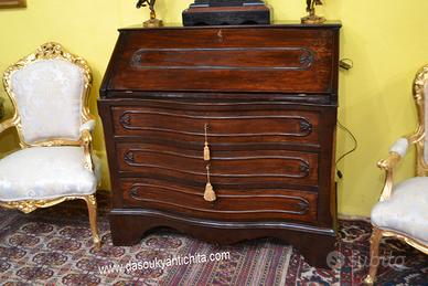 Antico scrittoio a ribalta in stile barocchetto lombardo della fine 800 inizi del 900 in noce, interamente impiallacciato in radica di noce, abbellito da cornicette in rilievo sagomate e curve che seguono il profilo superiore e inferiore dei cassetti