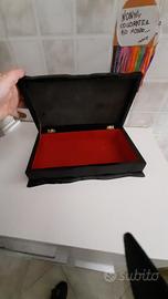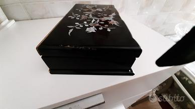 scatola laccata nero di fattura asiatica decorata con intarsi in madreperla raffiguranti uccelli e rami fioriti... pronta un segno in un angolo... misure in foto..