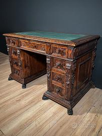 Importante scrittoio italiano in noce massello, riccamente scolpito a mano su