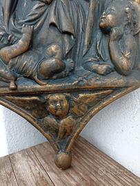 vecchia scultura, bassorilievo di madonna con bambino e putto in gesso patinato. altezza cm 40, larghezza cm 21