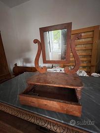 Bellissima toeletta da tavolo con specchiera in legno massello, probabilmente realizzata nella seconda metà del XIX secolo (intorno al 1850-1880). Questo tipo di mobile era comunemente utilizzato come specchiera da appoggio su comò o toilette nelle camere da letto borghesi, soprattutto nei contesti urbani eleganti come Trastevere a Roma.