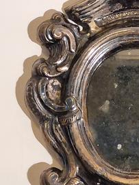 Antica specchiera in metallo sbalzato e argentato, con specchio. Cornice in stile barocco, dimensioni circa 30 altezza x 23 cm, realizzata a mano in Italia nei primi anni dell'800 in lamina di metallo con argentatura. I motivi a volute in rilievo sono realizzati tramite sbalzi per mezzo di martellature effettuate dal retro. Completa di specchio antico