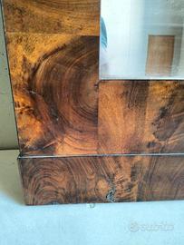 Bella specchiera antica primo ottocento placcata in noce con una bordatura dorata nella parte alta qualche piccola mancanza e specchio rotto. Misura 86/h 152